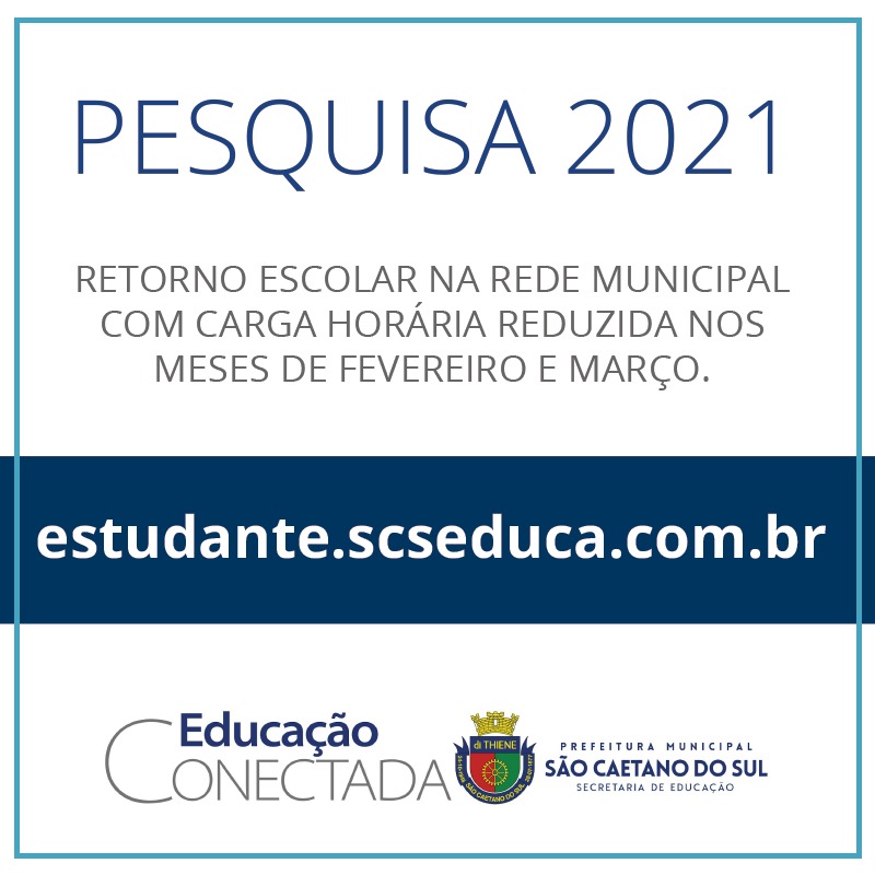 A Prefeitura de São Caetano do Sul, por meio da Secretaria de Educação, está realizando uma nova pesquisa de intenção acerca da retomada das aulas presenciais. A pesquisa está disponível na Plataforma Educação Conectada e pode ser acessada em: estudante.scseduca.com.br